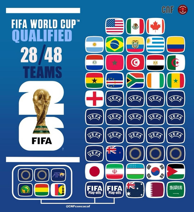 Như vậy, sau hơn một năm thi đấu khốc liệt, 28 đội bóng đã chính thức ghi tên vào danh sách dự World Cup 2026, trong tổng số 48 đội sẽ tranh T tại giải đấu lớn nhất lịch sử FIFA. Những tấm vé còn lại sẽ được phân định trong các lượt trận cuối cùng của vòng loại tại châu Âu, châu Phi và các trận play-off liên lục địa diễn ra đầu năm 2026.