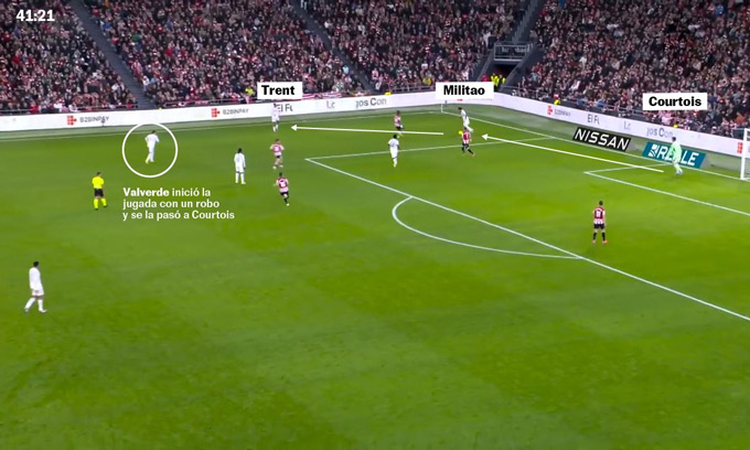 Valverde chuyền về cho Courtois, từ đó Real Madrid bắt đầu xây dựng pha lên bóng. Bóng được đưa sang cho Militao, rồi mở ra biên phải cho Trent. Trong lúc ấy, Valverde đã băng lên phía trước và nhận lại đường chuyền chuẩn xác vượt qua đầu một đối thủ từ hậu vệ người Anh.