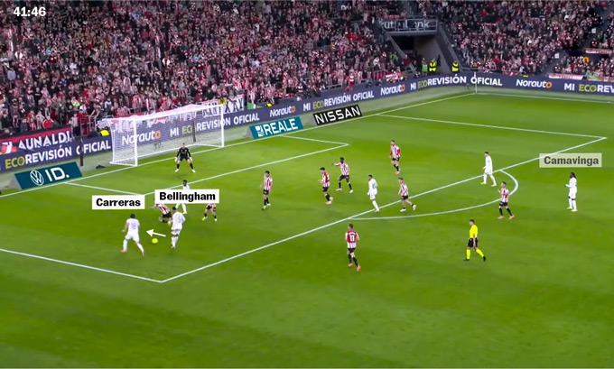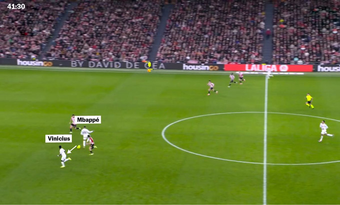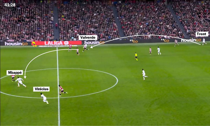 Ngẩng đầu quan sát, Valverde thấy Vinicius và Mbappe đang tăng tốc ở cánh đối diện, phía sau hàng phòng ngự Bilbao. Anh chuyền chéo cho Mbappe và tiền đạo người Pháp lại mở sang cho Vinicius. Chỉ 15 giây sau pha cướp bóng, Real Madrid đã áp sát vòng cấm của Unai Simon. Họ đã thoát pressing. "Đó là một pha thoát áp lực rất tốt", Courtois mô tả. "Có lẽ đây chính là điều chúng tôi còn thiếu trong một số trận trước".