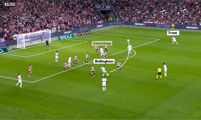 Trên băng ghế huấn luyện, Alonso tỏ rõ sự hài lòng: "Tôi có cảm giác rất tốt về cách chúng tôi đưa ra lựa chọn, cách chúng tôi tiếp cận khung thành, cách đổi cánh, cách tiến lên…". Bên cánh trái, các cầu thủ di chuyển liên tục, hoán đổi vị trí, thêm người tham gia tấn công, song Bilbao phòng ngự rất chặt và dồn ngày càng nhiều quân vào khu vực đó. Bellingham nhận ra cánh đối diện có thể đang trống trải, xoay người và mở bóng sang phải, nơi Trent đang băng lên.