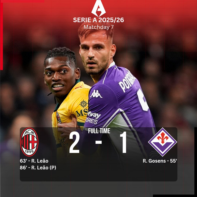 Đây là cú đúp đầu tiên của Leao tại Serie A kể từ tháng 11/2024, giúp AC Milan vươn lên ngôi đầu bảng xếp hạng với 16 điểm. Họ đang hơn 3 đội xếp sau là Inter, Napoli và Roma đúng 1 điểm.