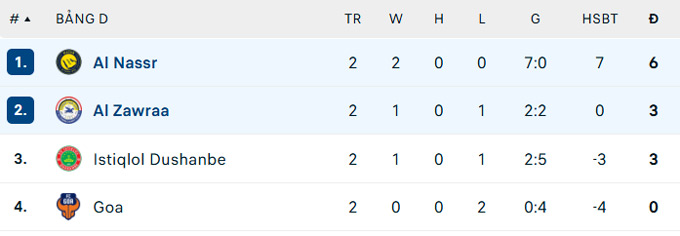 Như vậy, sau hai lượt trận, Al Nassr toàn thắng ở AFC Champions League Two với 6 điểm, hơn đội nhì Al Zawraa 3 điểm. Ở lượt trận tiếp theo, Al Nassr sẽ gặp Goa của Ấn Độ.