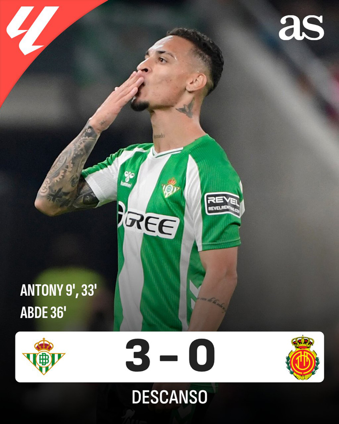 Tới phút 34, Antony hoàn tất cú đúp của bản thân và lần này người chuyền bóng cho anh là Bellerin. Đến phút 37, Antony sắm vai người kiến tạo để Ezzalzouli ấn định chiến thắng 3-0 cho Betis.