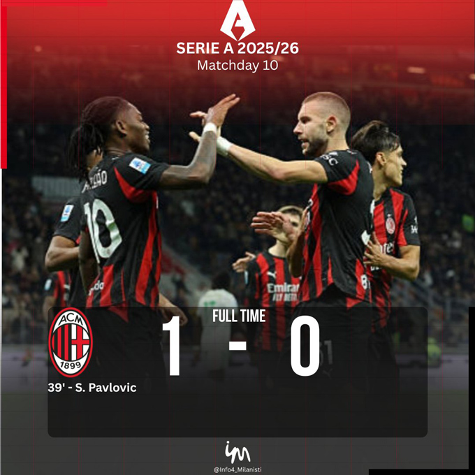 Chuyển sang vòng 10 Serie A, AC Milan thi đấu trên sân nhà tiếp đón AS Roma. Phải tới phút 39, bàn thắng mở tỷ số mới tới sau khi Rafael Leao kiến tạo để Pavlovic dứt điểm chuẩn xác tung lưới Roma.