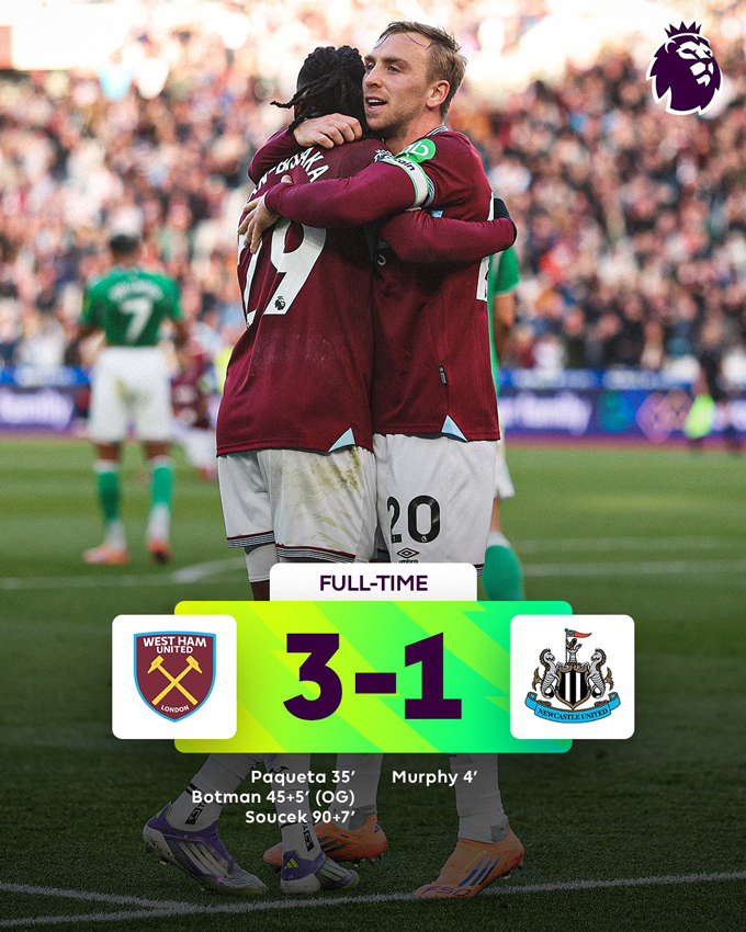 Phút bù giờ thứ 5 của hiệp 1, hậu vệ Sven Botman của Newcastle lóng ngóng đá phản lưới nhà giúp Búa tạ vươn lên dẫn 2-1. Và tới phút bù giờ thứ 7 của hiệp 2, Tomas Soucek ghi bàn ấn định chiến thắng 3-1 cho West Ham.