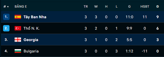 Chiến thắng tưng bừng trên sân khách giúp Thổ Nhĩ Kỳ vươn lên thứ 2 tại bảng E do ở trận cùng giờ, Georgia thất bại trước Tây Ban Nha. Ngày 14/10, Thổ Nhĩ Kỳ sẽ có trận đấu quan trọng với Georgia. Đội thắng sẽ nắm lợi thế trong cuộc cạnh tranhvị trí số 1 với Tây Ban Nha cũng như tấm vé dự vòng play-off.