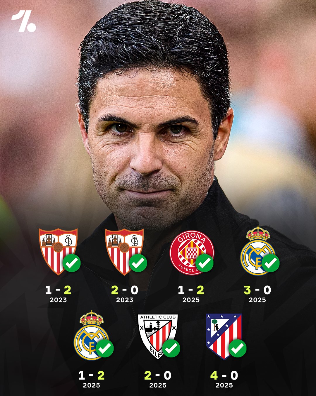 Chuỗi trận ấn tượng này bao gồm các chiến thắng trước những đội bóng như Real Madrid (2 trận), Sevilla (2 trận), Girona, Bilbao và mới nhất là Atlético Madrid. Thành tích này không chỉ khẳng định sức mạnh của Arsenal mà còn thể hiện sự vượt trội của họ trước các đội bóng Tây Ban Nha.