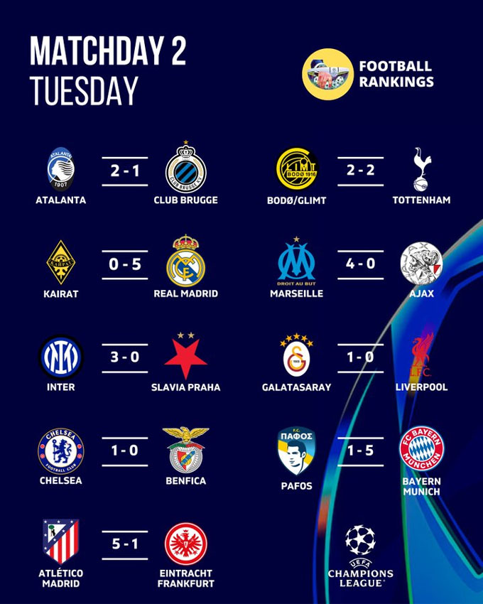 6 đội bóng vẫn đang toàn thắng tại lượt trận thứ hai vòng phân hạng Champions League 2025/26 là Bayern Munich, Real Madrid, PSG, Inter Milan, Arsenal và bất ngờ nhất là Qarabag.