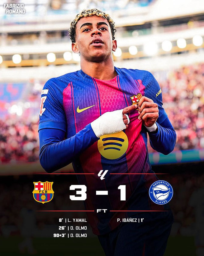Trong thời gian còn lại của trận đấu, Barca đã tạo ra hàng tá cơ hội ngon ăn nhưng đều không thể tận dụng thành công. Phải tới phút 90+3, Yamal chọc khe cho Olmo kết thúc chính xác một pha phản công nhanh để hoàn tất cú đúp của bản thân đồng thời ấn định chiến thắng 3-1 cho Barca.