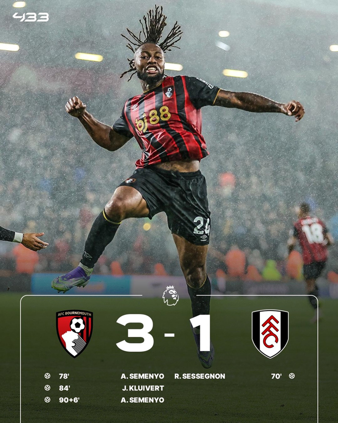 Phút 78, Semenyo dứt điểm góc hẹp đánh bại thủ thành Leno gỡ hoà 1-1. Tới phút 84, cầu thủ vào sân thay người Justin Kluivert tung cú sút xa từ cự ly 30m đưa Bournemouth vượt lên dẫn 2-1. Và tới phút bù giờ thứ 6 của hiệp 2, Semenyo đã ghi bàn ấn định chiến thắng 3-1 cho đội chủ nhà.