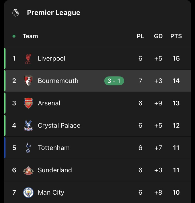 Với chiến thắng này, Bournemouth đã tạm chiếm vị trí thứ 2 trên BXH với 14 điểm sau 7 vòng, chỉ kém đội đầu bảng Liverpool 1 điểm. Tất nhiên họ đang đá nhiều hơn 1 trận và 4 đội xếp sau (Arsenal, Crystal Palace, Sunderland, Tottenham) có thể đẩy họ xuống ở vòng này.