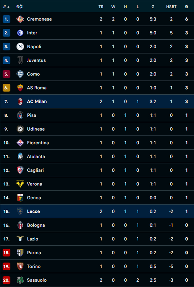 Với chiến thắng này, Milan có được ba điểm đầu tiên của mùa giải Serie A, trong khi Lecce vẫn phải tìm kiếm điểm số trong các trận đấu tới. Theo lịch thi đấu, đối thủ tiếp theo của Milan là Bologna.