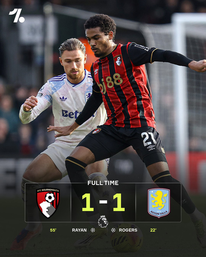Morgan Rogers mở tỷ số cho Villa ở phút 22 nhưng tới phút 55, Rayan đã ghi bàn gỡ hòa cho đội chủ nhà Bournemouth. Đây đã là trận đấu thứ 2 liên tiếp mà Villa không thắng. Ở vòng đấu trước, họ để thua 0-1 trên sân nhà trước Brentford.