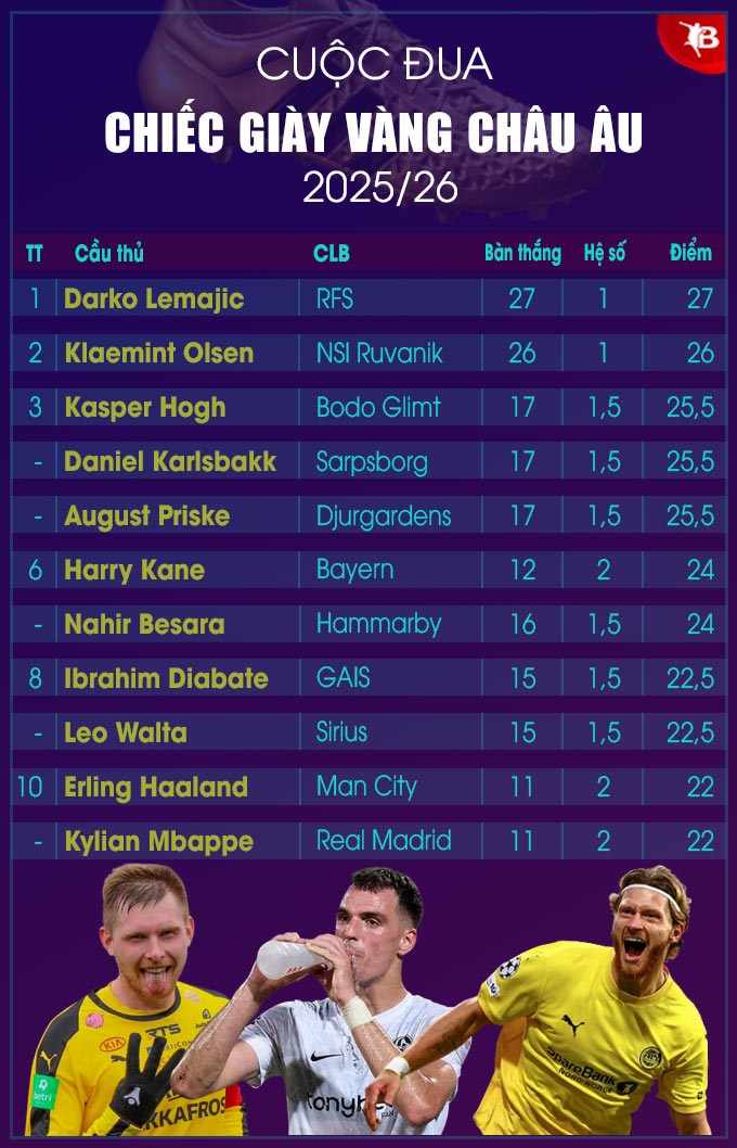 Chiếc giày Vàng châu Âu 2025/26: Haaland, Mbappe và Kane chưa vào Top 5
