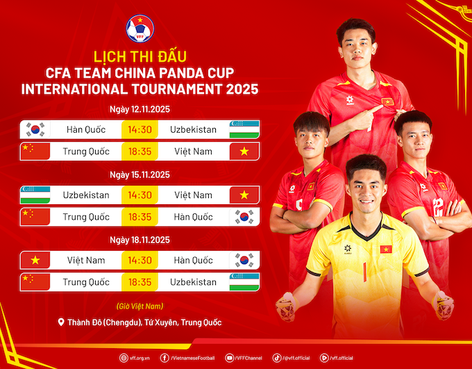 Theo đó, U22 Việt Nam sẽ tham dự giải bóng đá quốc tế CFA Team China Panda Cup 2025, với sự tham dự của Hàn Quốc, Uzbekistan, Trung Quốc và U22 Việt Nam, diễn ra từ ngày 12 đến 18/11 tại thành phố Thành Đô (tỉnh Tứ Xuyên, Trung Quốc). Đây là lần thứ 3 liên tiếp U22 Việt Nam được mời tham dự giải đấu này.