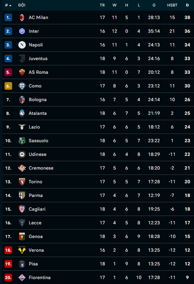 Lúc này, Como chỉ còn kém nhóm dự Champions League có 3 điểm. Thậm chí, họ chỉ kém đội dẫn đầu AC Milan có 8 điểm - điều này đồng nghĩa với việc, đội bóng của HLV Cesc Fabregas hoàn toàn có thể mơ về kỳ tích trong phần còn lại của mùa giải 2025/26 nếu họ vẫn biết cách duy trì sự ổn định và hiệu quả như hiện nay.
