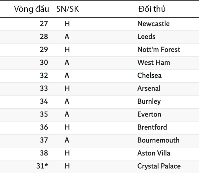 Đây sẽ là chặng nước rút chia làm hai nửa, với mọi thứ dồn vào cuộc đối đầu giữa Man City và Arsenal vào giữa tháng Tư, rồi sau đó là những hệ quả tiếp theo. Tuy nhiên, lịch thi đấu của Arsenal trước và sau chuyến làm khách tại Etihad có vẻ thuận lợi hơn so với của Man City, đặc biệt là giai đoạn cuối.