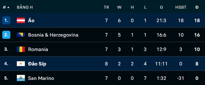 Chung cuộc, nhờ cú đúp bàn thắng của Arnautovic, Áo đánh bại Đảo Síp 2-0 để đứng vững ngôi đầu bảng H, thắng 6 và để thua duy nhất 1 trận. Họ đang hơn đội nhì bảng Bosnia (2 điểm) và nắm quyền tự quyết trong tay.