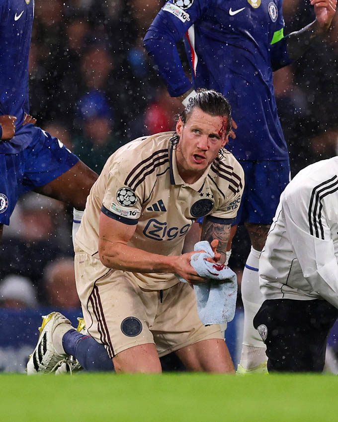 Ngay lập tức, cầu thủ người Hà Lan ngã xuống sân với vết rách lớn trên đầu, máu chảy khiến trọng T phải tạm dừng trận đấu để đội ngũ y tế vào sân.