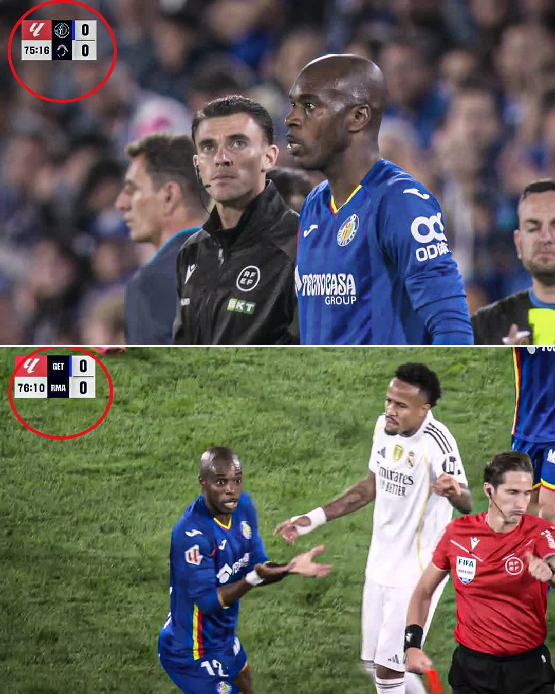 Trọng T lập tức rút thẻ đỏ trực tiếp bất chấp sự phản đối dữ dội từ phía cầu thủ và ban huấn luyện Getafe. Quyết định này khiến mọi thứ trở nên vô cùng căng thẳng. Nhiều cầu thủ dự bị của Getafe lao ra sân để phản ứng, buộc tổ trọng T và các cầu thủ Real phải can thiệp để tránh xung đột bùng phát.