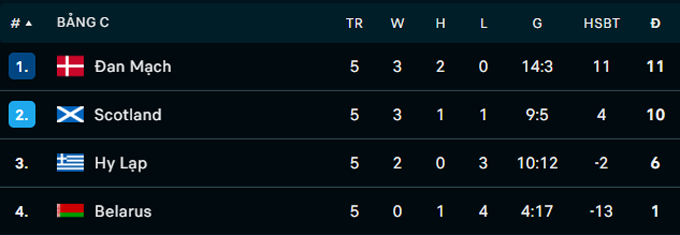 Trong ngày hàng công hoạt động thiếu hiệu quả, Rasmus Hojlund và các đồng đội phải hối tiếc vì bỏ lỡ quá nhiều cơ hội, bởi ở trận cùng giờ, Scotland để thua Hy Lạp 2-3. Ở lượt cuối, Đan Mạch và Scotland sẽ quyết chiến cho tấm vé dự thẳng World Cup của bảng C. Đan Mạch có lợi thế về điểm số (11 so với 10) nhưng Scott Mctominay và đồng đội có lợi thế sân nhà.