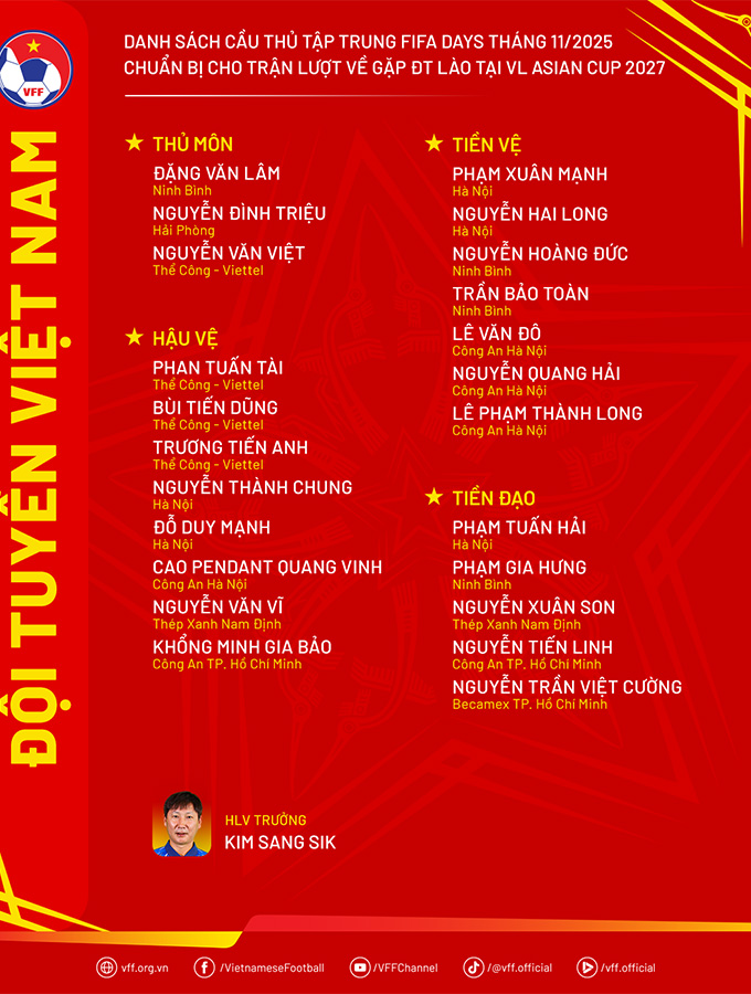 Ngày 6/11, HLV trưởng Kim Sang Sik đã công bố danh sách 23 cầu thủ đội tuyển Việt Nam tập trung chuẩn bị cho trận đấu với đội tuyển Lào trong khuôn khổ lượt về vòng loại cuối Asian Cup 2027. Toàn đội sẽ hội quân vào ngày 10/11 tại Việt Trì (Phú Thọ) và dự kiến di chuyển sang Lào vào ngày 15/11.