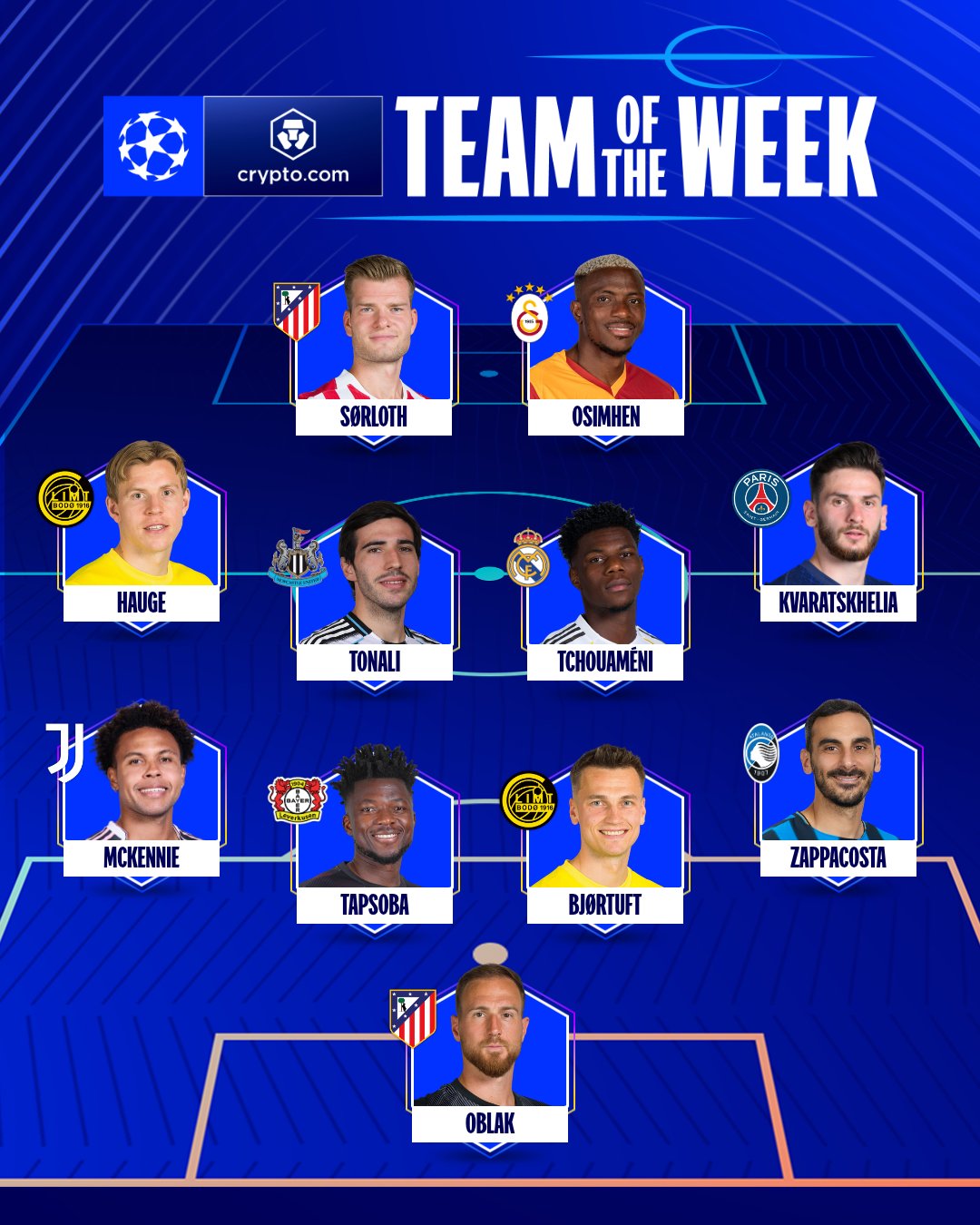 Vị trí thủ môn thuộc về Jan Oblak của Atletico. Như mọi khi, thủ môn người Slovenia gây ấn tượng mạnh với khả năng xử lý tốt và luôn làm điểm tựa cho đội nhà. Như trong trận gặp Club Brugge, anh có hàng loạt pha cứu thua ấn tượng. Ngoài ra, Oblak còn thực hiện đường chuyền dẫn đến bàn thắng đầu tiên của Sorloth.