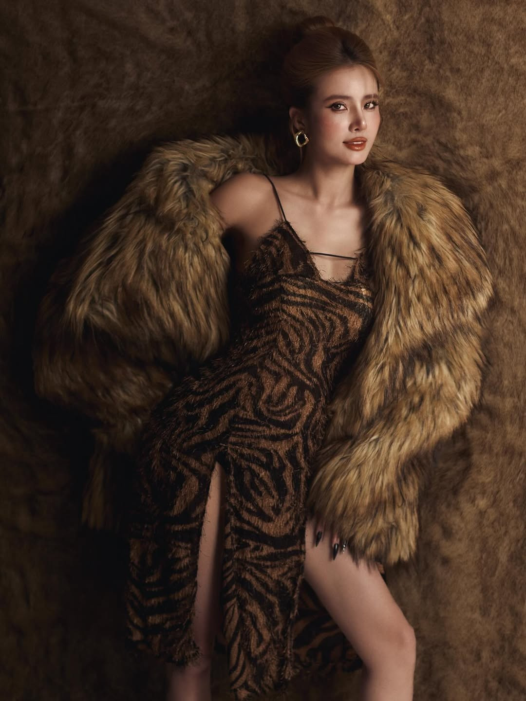 Với layout trang điểm nhấn vào đôi mắt và bờ môi căng mọng, Khánh Chi làm toát lên vẻ đẹp rất... khó tả nhưng khiến người ta phải say đắm. Bên cạnh đó, sự kết hợp giữa chất liệu lông mềm mại và họa tiết hoang dã không chỉ giúp Khánh Chi tôn lên vóc dáng thon gọn mà còn thể hiện thần thái cuốn hút, tự tin.