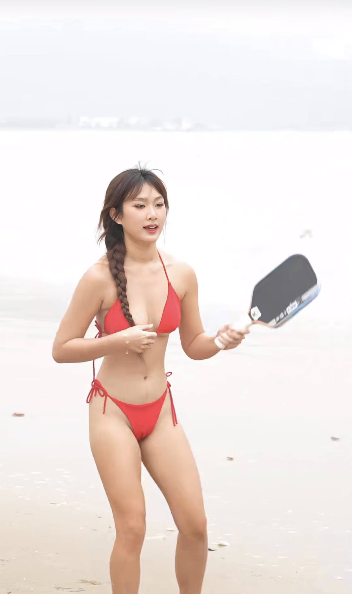 Đoạn clip được đăng tải trên TikTok và Facebook cho thấy cô nàng mặc bộ bikini hai mảnh táo bạo, tự tin cầm vợt và thể hiện các pha đánh pickleball ngay trên bờ cát, cạnh sóng biển xanh.