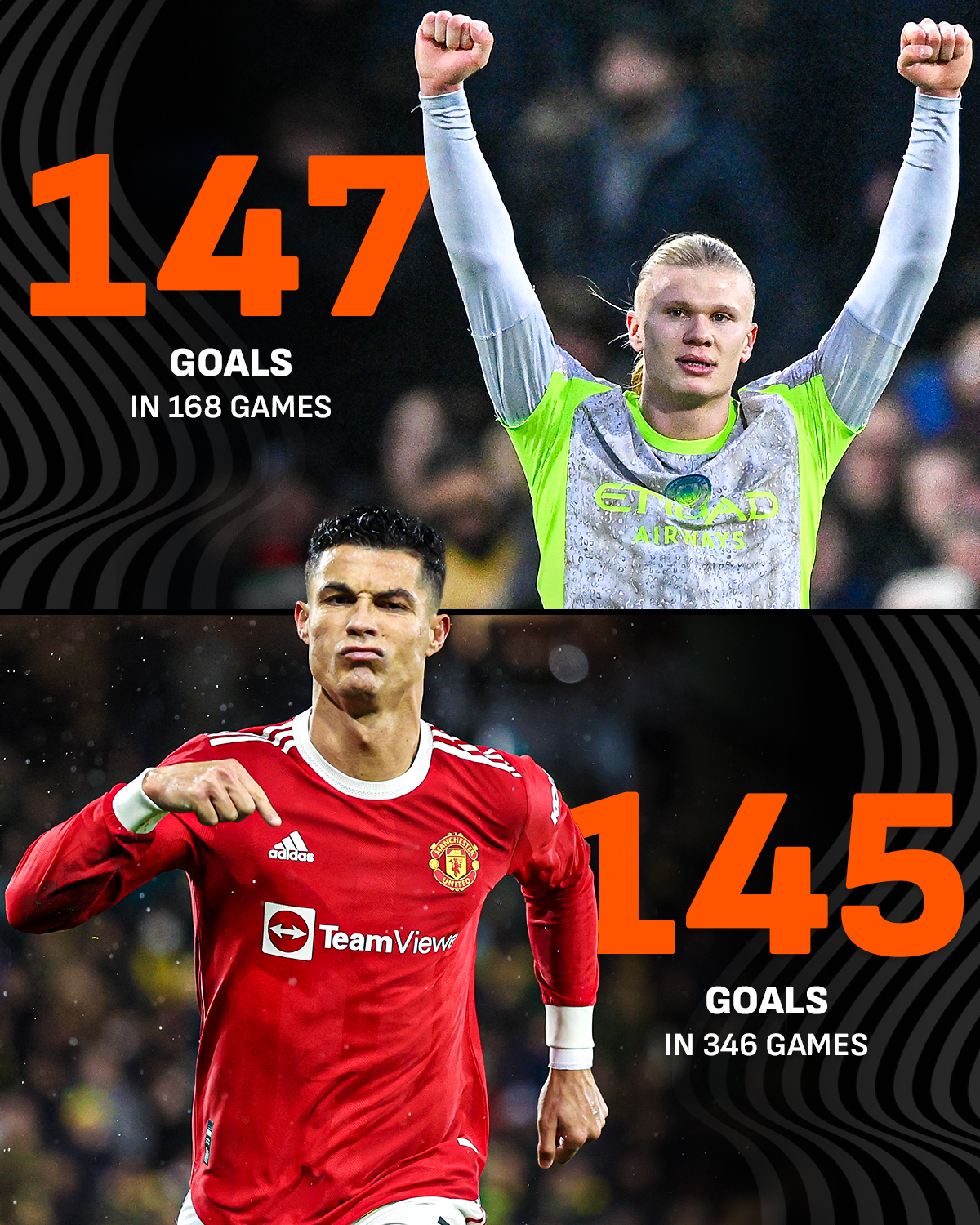 Ngoài ra, Haaland còn vượt qua siêu sao Cristiano Ronaldo về tổng số bàn thắng ghi được cho một CLB ở Ngoại hạng Anh. Cụ thể, Haaland có 147 bàn sau 168 trận trên mọi đấu trường trong màu áo Man City, trong khi Ronaldo ghi 145 bàn sau 346 trận cho MU.