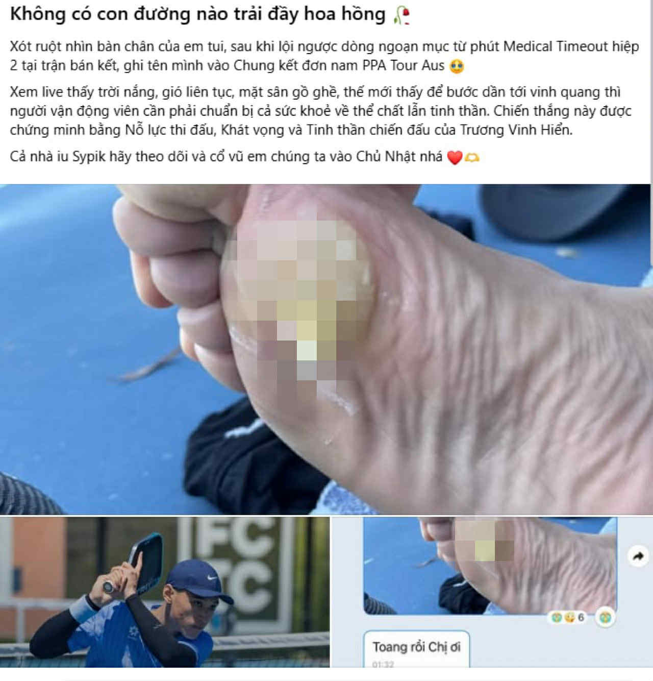 Do trận bán kết đơn nam PPA Tour Australia 2025 diễn ra chiều ngày 13/11 giữa trời nắng nóng đã khiến bàn chân của Vinh Hiển rộp lên. VĐV này thậm chí còn phải xin tạm dừng trận đấu ở hiệp 2 vì đau rát. Đến cuối cùng Vinh Hiển vẫn kiên cường thi đấu, lội ngược dòng ấn tượng để vào trận chung kết.