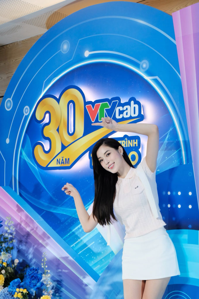 Mái tóc đen dài buông tự nhiên, gương mặt rạng ngời cùng nụ cười tươi tắn giúp cô càng thêm nổi bật trước phông nền sự kiện. Dù không còn thi đấu chuyên nghiệp, Huyền vẫn giữ được vóc dáng gọn gàng, săn chắc, chứng tỏ ý thức giữ gìn hình thể của một vận động viên.
