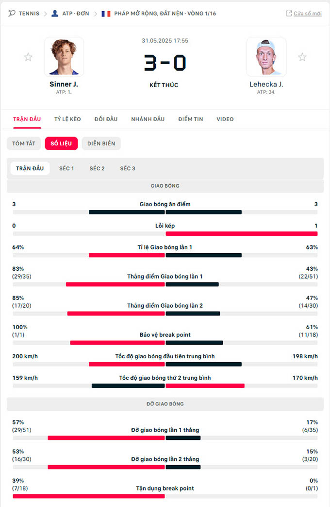 Trong điều kiện thời tiết u ám tại sân Suzanne Lenglen, Sinner thể hiện lối đánh bền bỉ và chính xác từ cuối sân, đồng thời dễ dàng hóa giải các cú giao bóng của Lehecka. Điều này được thể hiện rõ qua hàng loạt cú trả giao bóng uy lực, đặc biệt là hai cú thuận tay ghi điểm trong game áp chót của set hai.