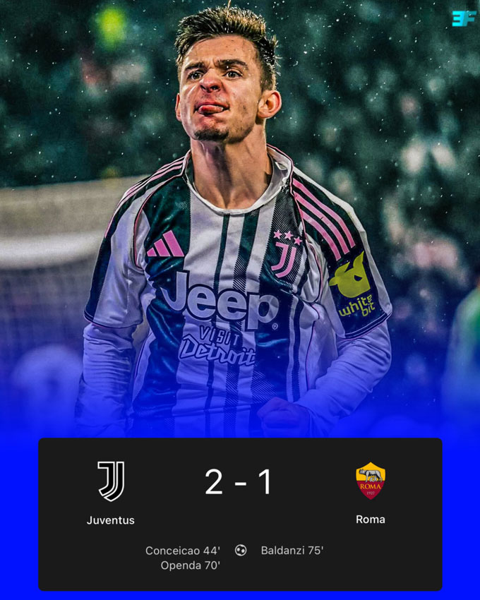 Tại vòng 16 Serie A 2025/26, Juventus tiếp đón AS Roma trên sân nhà với tham vọng tiến sát với top 4. Phải đến phút 44, đội chủ nhà mới có bàn mở tỷ số nhờ công của Conceicao.