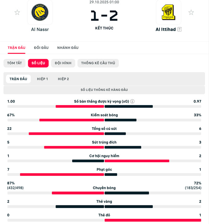 Nhưng dù được chơi hơn người, Ronaldo và các đồng đội vẫn không thể xuyên thủng hàng thủ kín kẽ của Al Ittihad và đành chấp nhận thất bại với tỷ số 1-2. Thắng trận, Al Ittihad của Benzema giành vé vào tứ kết King's Cup Saudi Arabia.