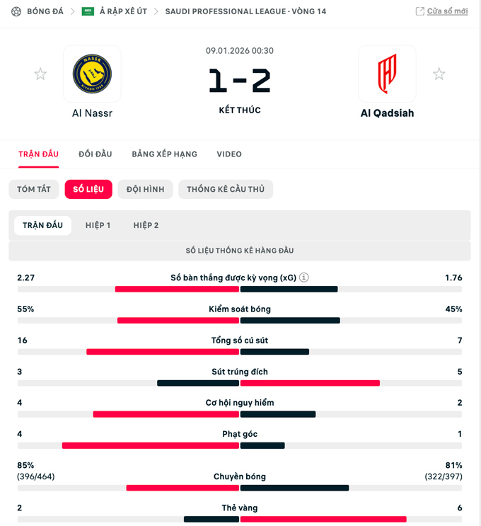 Kết quả Al Nassr 1-2 Al Qadsiah: Mình Ronaldo là không đủ