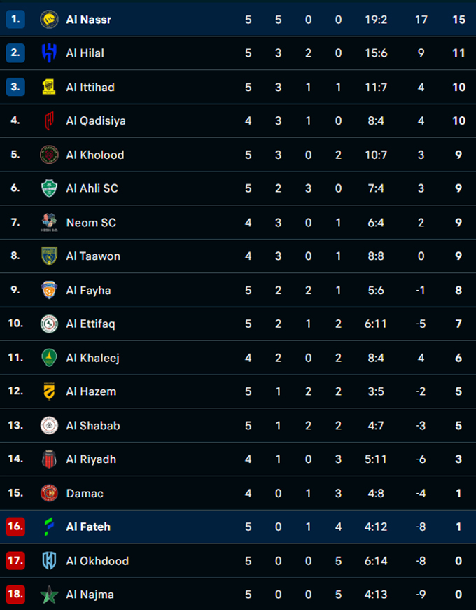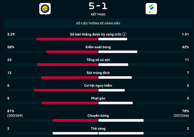 Như vậy, Al Nassr khép lại trận đấu với chiến thắng đậm đà 5-1. Kết quả này giúp đoàn quân của HLV Jorge Jesus tiếp tục củng cố ngôi đầu bảng với 15 điểm tuyệt đối sau 5 vòng đấu.