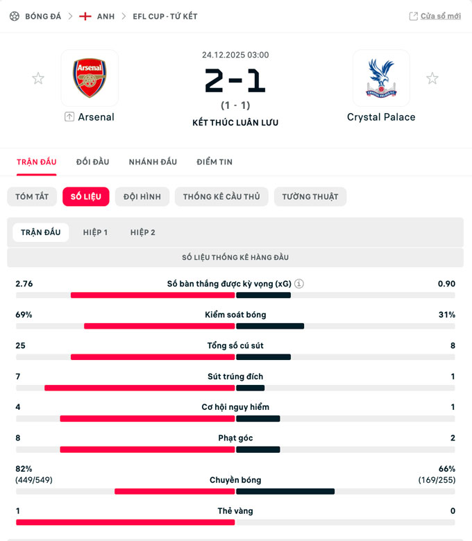 Arsenal thắng 8-7 Crystal Palace ở loạt luân lưu, qua đó đoạt vé đến bán kết League Cup. Đối thủ sắp tới của họ sẽ là Chelsea.