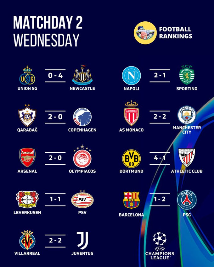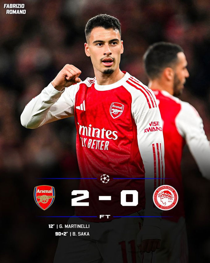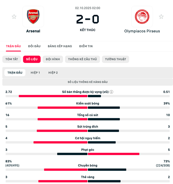 Kết quả cuối cùng của trận đấu này là 2-0 nghiêng về phía Arsenal. Pháo thủ vẫn đang có khởi đầu hoàn hảo tại Champions League mùa này với 2 trận toàn thắng.