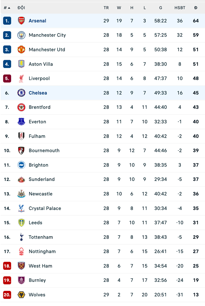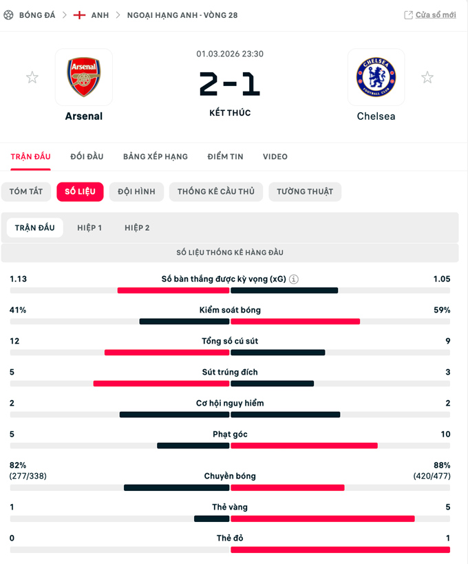 Chung cuộc, Arsenal giành chiến thắng nghẹt thở với tỷ số 2-1 trên sân nhà trước Chelsea. Pháo thủ tái lập cách biệt 5 điểm với Man City nhưng đang đá nhiều hơn 1 trận.