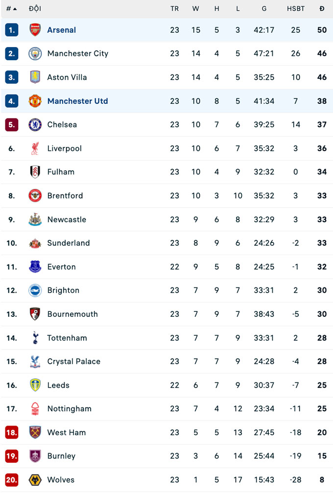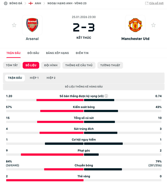 Dù hiệp 2 có tới 7 phút bù giờ nhưng Arsenal cũng không thể tìm được bàn gỡ và đành chấp nhận kết quả thua 2-3 ngay trên sân nhà. Kết quả này giúp Quỷ đỏ chiếm lấy vị trí thứ 4 trên BXH trong khi Pháo thủ bị Man City thu hẹp cách biệt xuống còn 4 điểm.