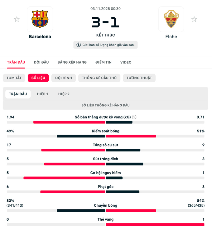 Chỉ 2 phút sau, một pha cắt bóng hỏng của hậu vệ Elche tạo cơ hội cho Fermin Lopez dọn cỗ để Ferran Torres nhân đôi cách biệt cho đội chủ nhà.