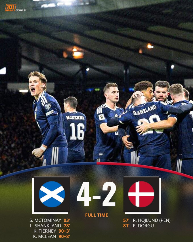 Tại bảng C, Scotland đánh bại Đan Mạch 4-2 để giành ngôi nhất bảng. Scotland có vé chính thức dự World Cup còn Đan Mạch phải đá play-off.
