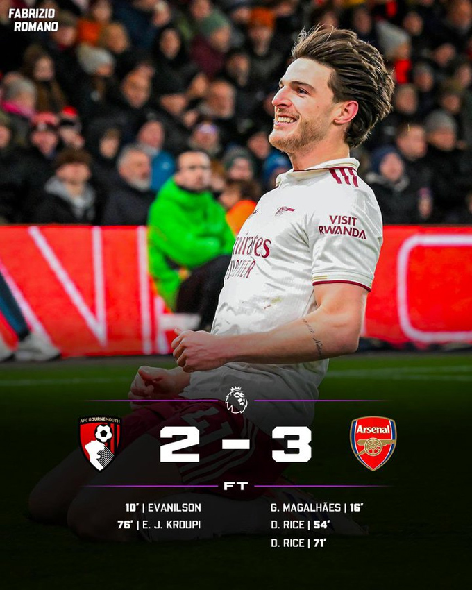 Ít giờ sau, Arsenal đã giành chiến thắng 3-2 trước Bournemouth. Kết quả này giúp Pháo thủ vững vàng ở ngôi đầu bảng với khoảng cách lớn so với nhóm bám đuổi.