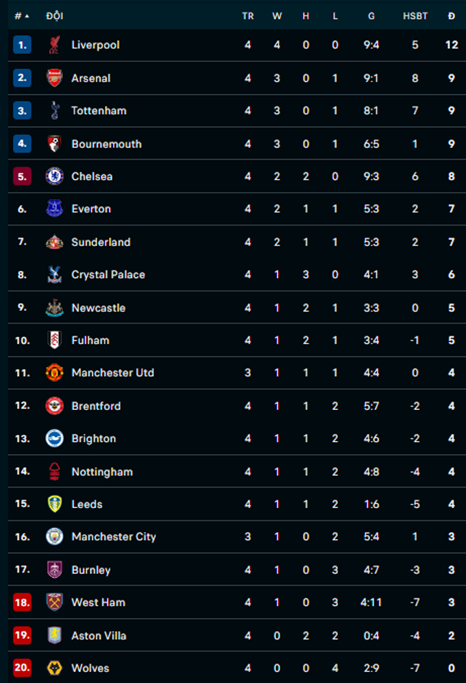 Thắng chật vật Burnley, Liverpool trở lại ngôi đầu bảng khi có 12 điểm, hơn 3 điểm so với 3 đội xếp sau gồm Arsenal, Tottenham và Bournemouth. Trong khi đó, Burnley xếp thứ 17 với chỉ 3 điểm.