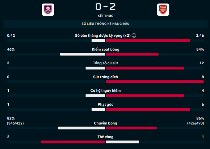 Về phần mình, Burnley gần như bất lực hoàn toàn trước đội bóng đang dẫn đầu BXH. Trong hiệp 1, đội bóng của Scott Parker thậm chí còn không thể tung nổi 1 cú dứt điểm về phía khung thành của Raya. Hiệp 1 khép lại với tỉ số 2-0 nghiêng về Arsenal