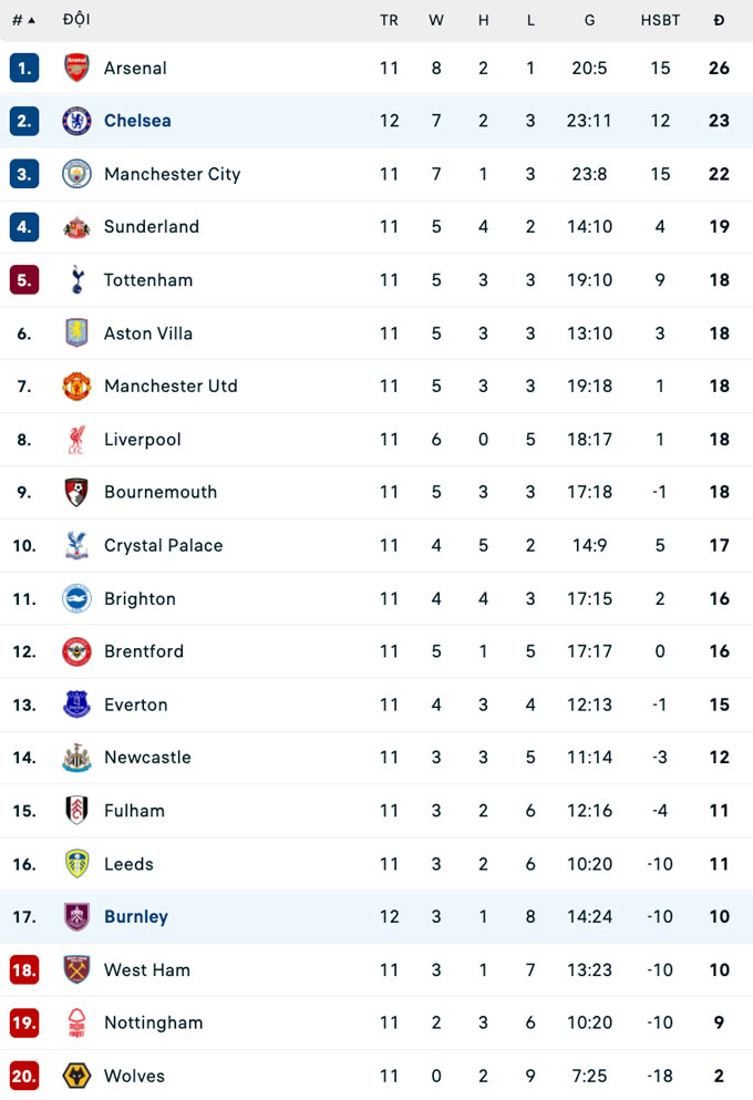 | TT | Đội bóng | Trận | +/- | Điểm |