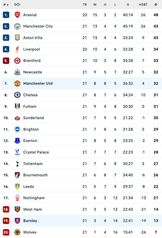 | TT | Đội bóng | Trận | +/- | Điểm |