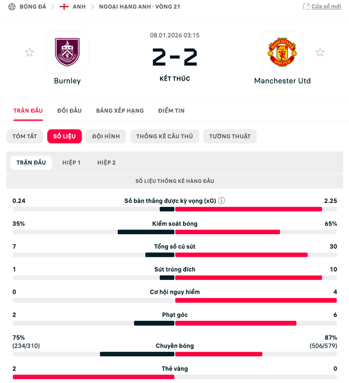 Hiệp 1 khép lại với tỷ số 1-0 nghiêng về phía đội chủ nhà. Nhưng ngay đầu hiệp 2, MU đã có bàn gỡ. Phút 50, Bruno Fernandes chọc khe chuẩn xác để Sesko di chuyển hay, phá bẫy việt vị rồi sút tung lưới Burnley.
