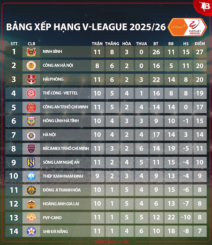 | TT | Đội bóng | Trận | +/- | Điểm |